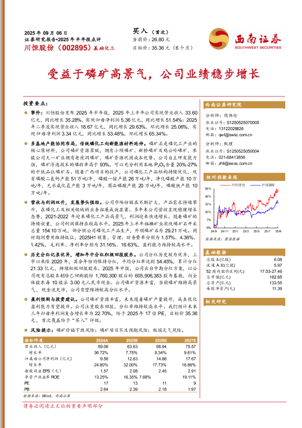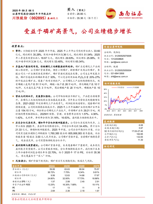 【西南证券】【202509】川恒股份:受益磷矿高景气,公司业绩稳步增长-13页