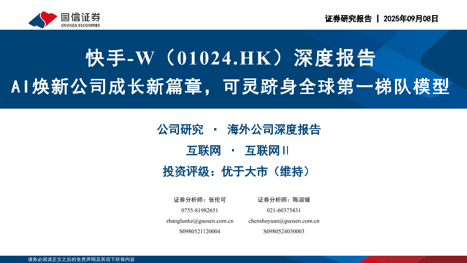 【国信证券】【202509】快手-W(01024.HK)深度报告:AI焕新公司成长新篇章,可灵跻身全球第一梯队模型-39页