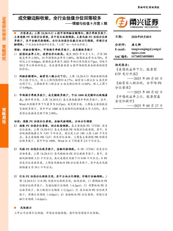 【甬兴证券】【202509】情绪与估值 9月第 1期——成交额边际收敛,全行业估值分位回落较多-11页