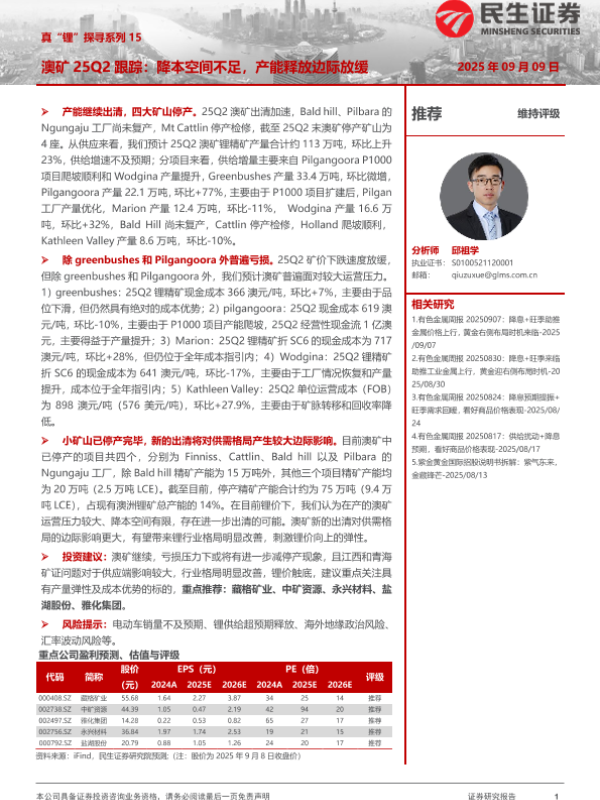 【民生证券】【202509】真“锂”探寻系列15-澳矿25Q2跟踪:降本空间不足,产能释放边际放缓-20页