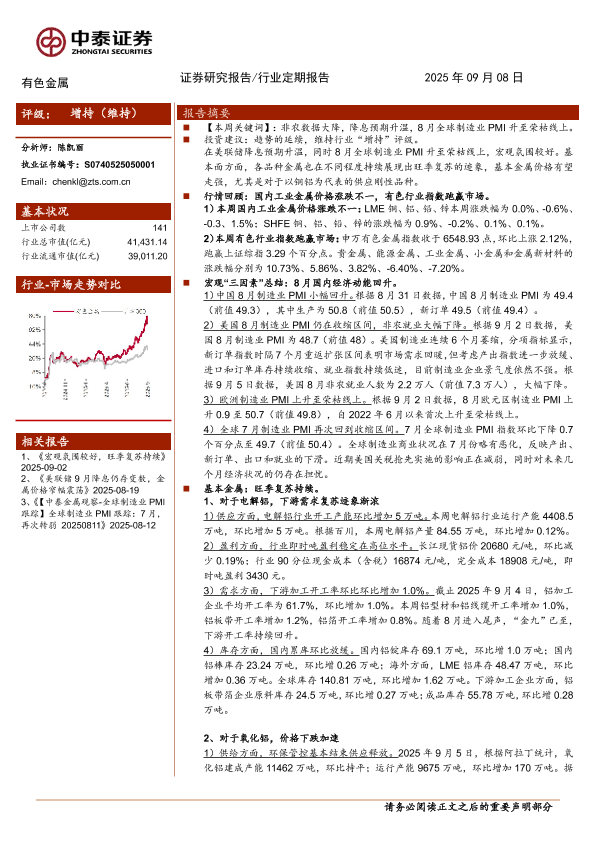 铜铝价格 旺季复苏 全球制造业PMI 行业评级 库存变化