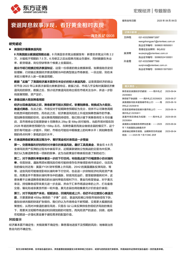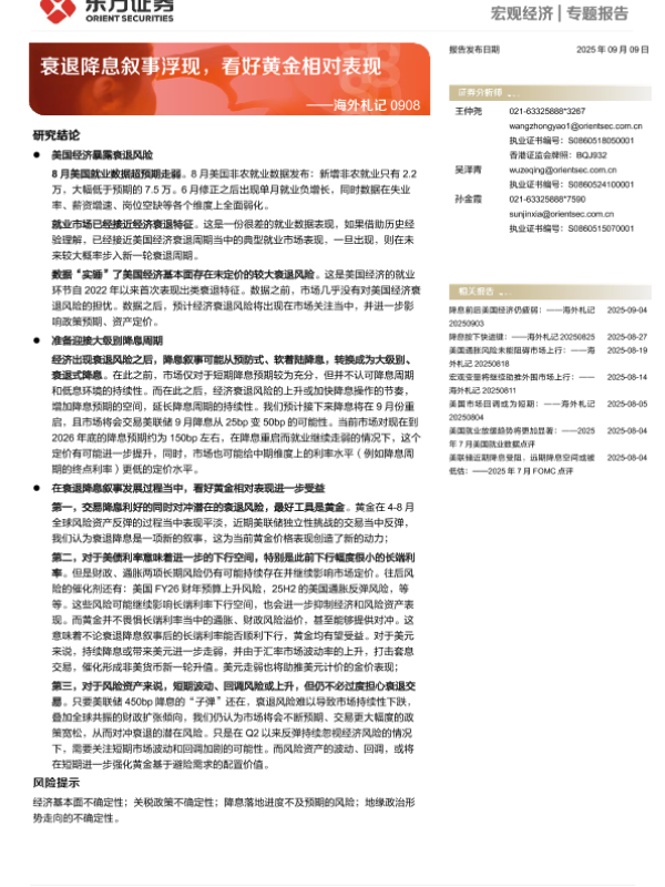【东方证券】【202509】海外札记:衰退降息叙事浮现,看好黄金相对表现-10页
