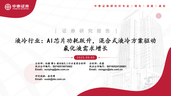 【中泰证券】【202509】液冷行业:A I芯片功耗跃升,混合式液冷方案驱动氟化液需求增长-21页