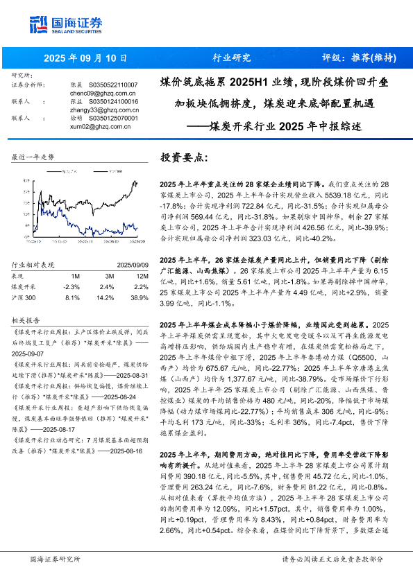 【国海证券】【202509】煤炭开采行业2025年中报综述:煤价筑底拖累2025H1业绩,现阶段煤价回升叠加板块低拥挤度,煤炭迎来底部配置机遇-26页