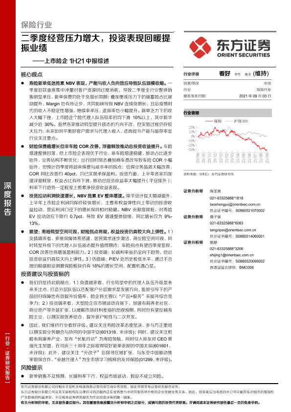 【东方证券】【20210903】保险行业上市险企1H21中报综述:二季度经营压力增大,投资表现回暖提振业绩-18页
