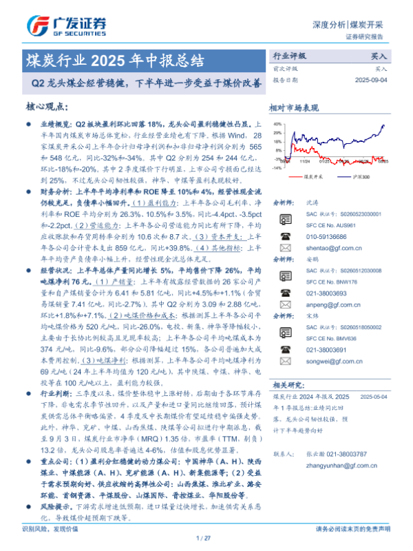 【广发证券】【202509】煤炭行业2025年中报总结:Q2龙头煤企经营稳健,下半年进一步受益于煤价改善-27页