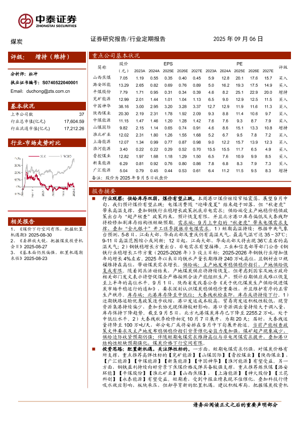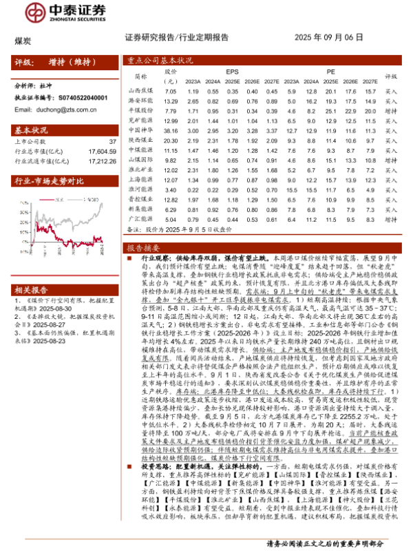 【中泰证券】【202509】煤炭行业:煤价季节性回落符合预期,把握板块配置窗口期-23页