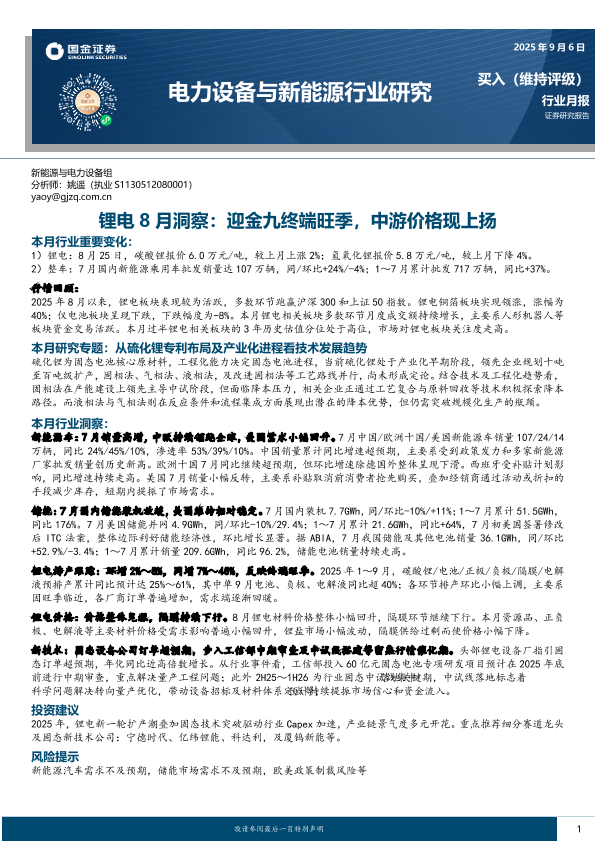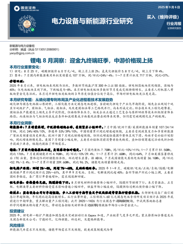 【国金证券】【202509】锂电8月洞察,迎金九终端旺季,中游价格现上扬-15页