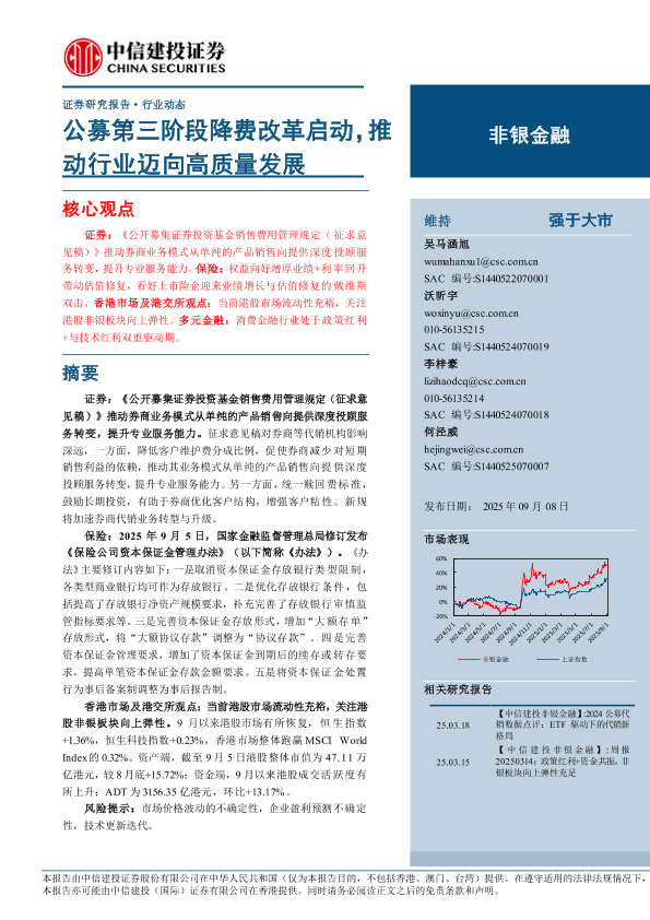 保险业绩 券商转型 降费改革 港股市场 公募基金