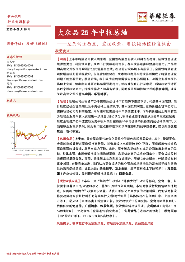 【华源证券】【202509】食品饮料行业专题报告:大众品25年中报总结——龙头韧性凸显,重视牧业、餐饮链估值修复机会-15页