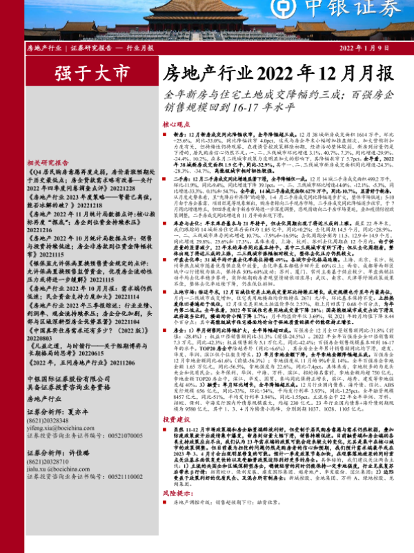 【中银证券】【20230109】房地产行业2022年12月月报:全年新房与住宅土地成交降幅约三成;百强房企销售规模回到16-17年水平-27页