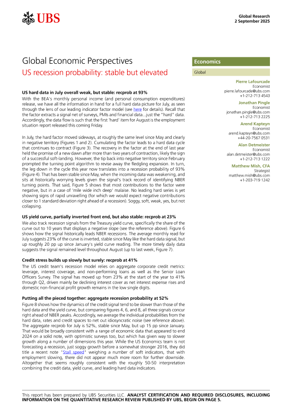 【UBS Securities LLC】【202509】Global Economic Perspectives _US recession probability stable but elevated-8页