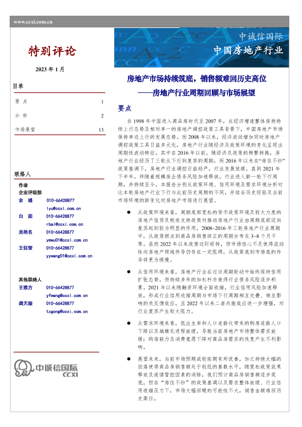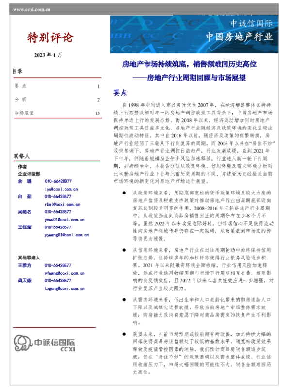【中诚信国际】【20230101】房地产行业周期回顾与市场展望:房地产市场持续筑底,销售额难回历史高位-15页