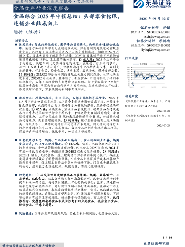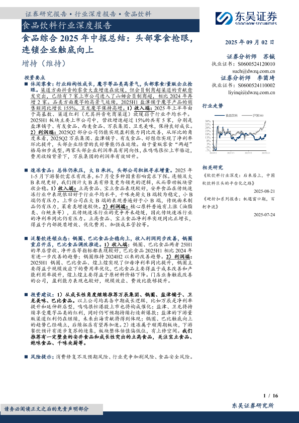 【东吴证券】【202509】食品综合 2025年中报总结:头部零食抢眼,连锁企业触底向上-16页