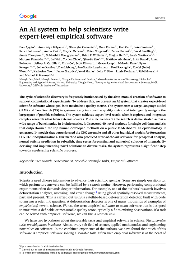 【Google DeepMind&Google Research&Google Platforms and Devices&Massachusetts Institute of Technology&Harvard University&Google Cloud&McGill University&California Institute of Technology】【202509】An AI system to help scientists write expert-level empirical software-71页