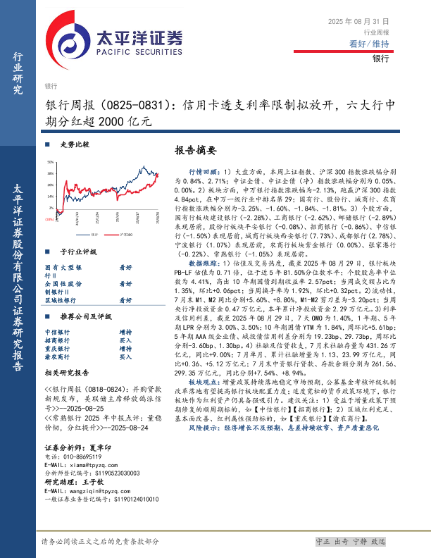 【太平洋证券】【202508】20250831-太平洋-银行业周报:信用卡透支利率限制拟放开,六大行中期分红超2000亿元-12页