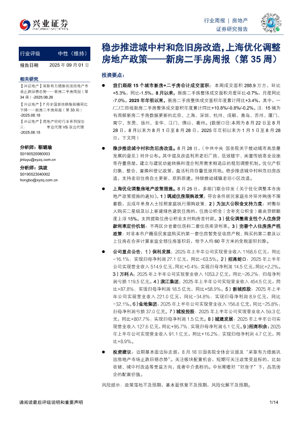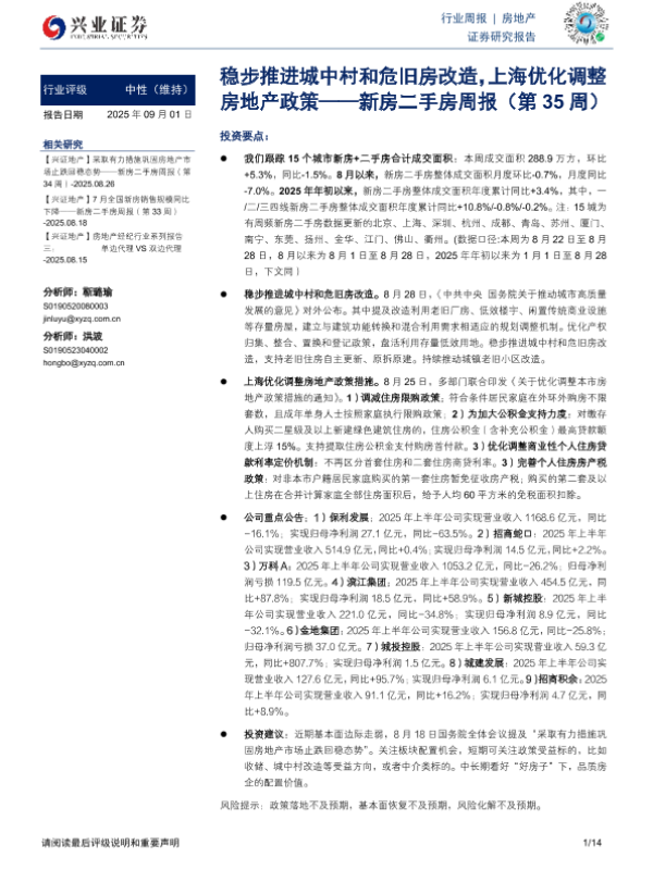 【兴业证券】【202509】20250901-兴业证券-新房二手房周报(第35周):稳步推进城中村和危旧房改造,上海优化调整房地产政策-14页