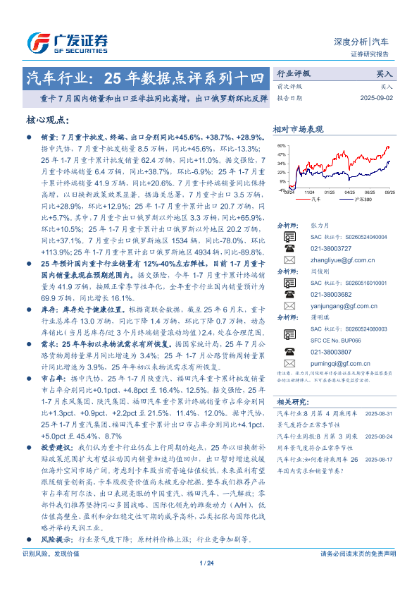 【广发证券】【202509】汽车行业:25年数据点评系列十四:重卡7月国内销量和出口亚非拉同比高增,出口俄罗斯环比反弹-24页