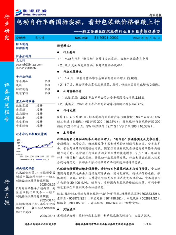 【渤海证券】【202509】电动自行车新国标实施,看好包装纸价格继续上行——轻工制造&纺织服饰行业9月投资策略展望-14页