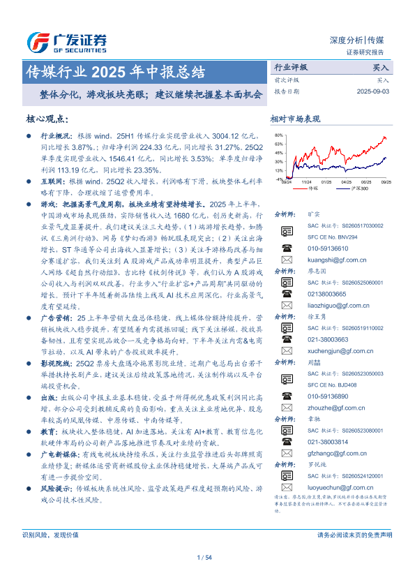 【广发证券】【202509】传媒行业2025年中报总结:整体分化,游戏板块亮眼;建议继续把握基本面机会-54页