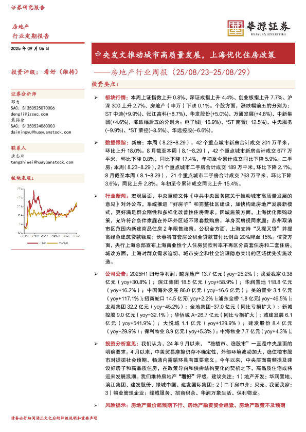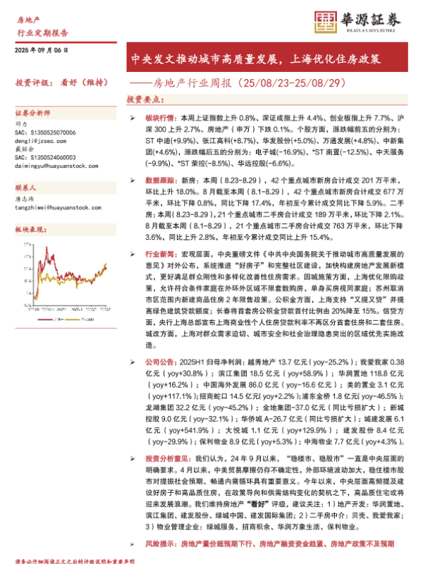 【华源证券】【202509】中央发文推动城市高质量发展,上海优化住房政策——房地产行业周报(25/08/23-25/08/29)-18页
