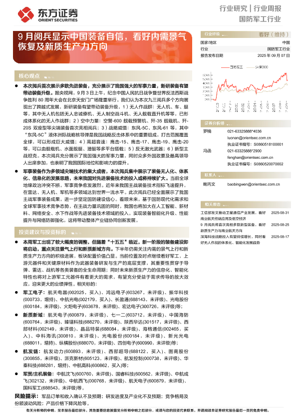 【东方证券】【202509】国防军工行业行业周报 —— 9月阅兵显示中国装备自信,看好内需景气恢复及新质生产力方向-12页