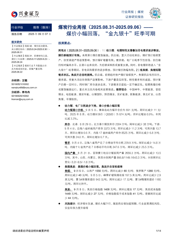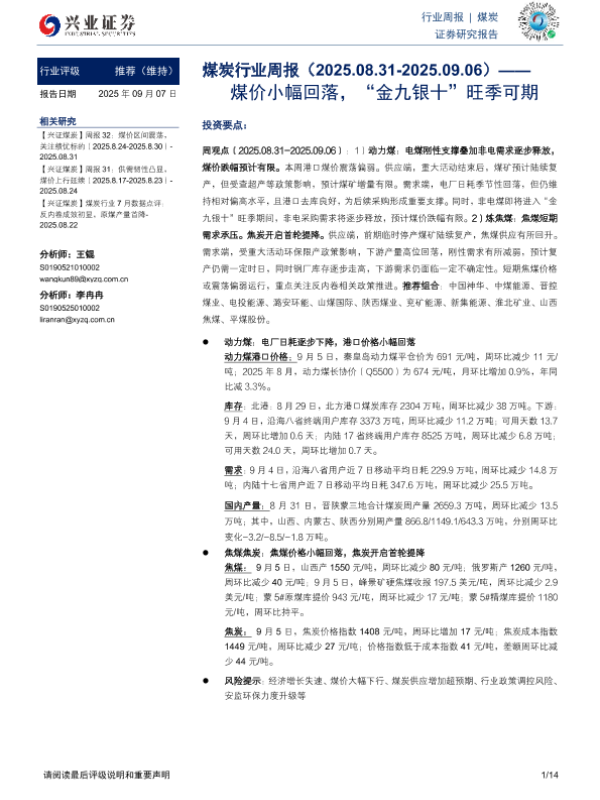 【兴业证券】【202509】煤价小幅回落,“金九银十”旺季可期-14页