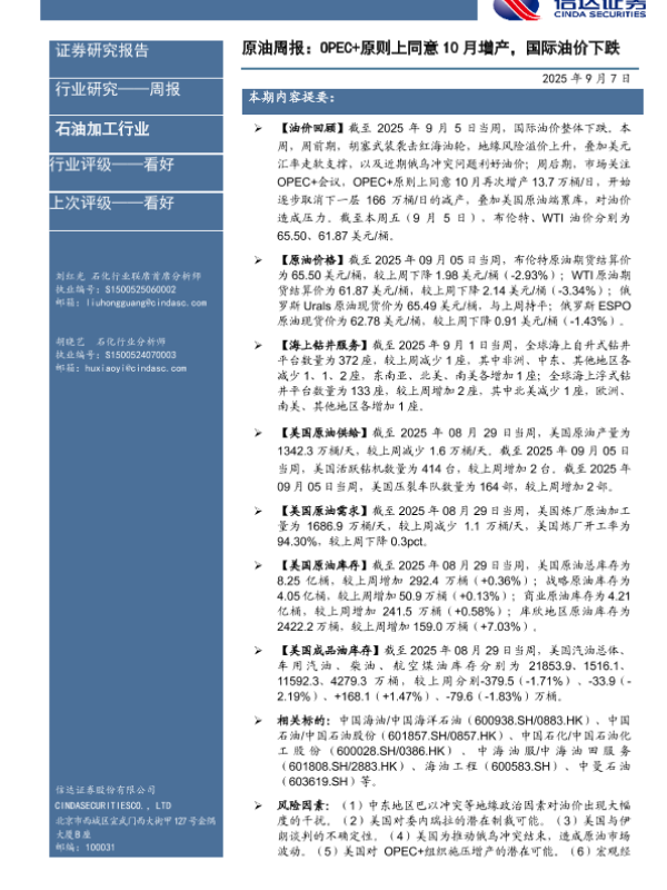 【信达证券】【202509】原油周报:OPEC+原则上同意 10月增产,国际油价下跌-26页