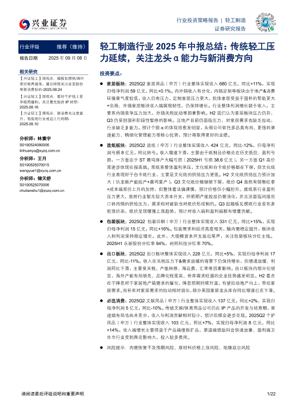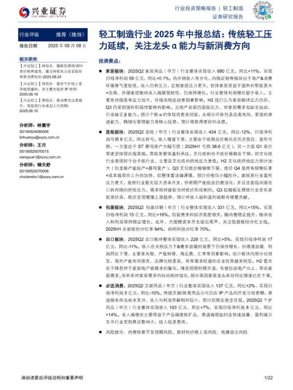 【兴业证券】【202509】轻工制造行业2025年中报总结:传统轻工压力延续,关注龙头α能力与新消费方向-22页