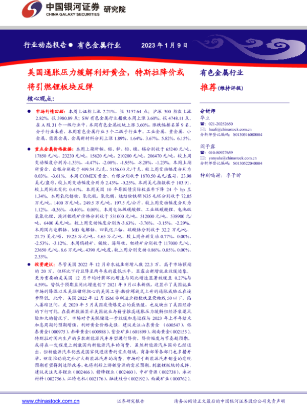 【银河证券】【20230109】有色金属行业动态报告:美国通胀压力缓解利好黄金,特斯拉降价或将引燃锂板块反弹-21页