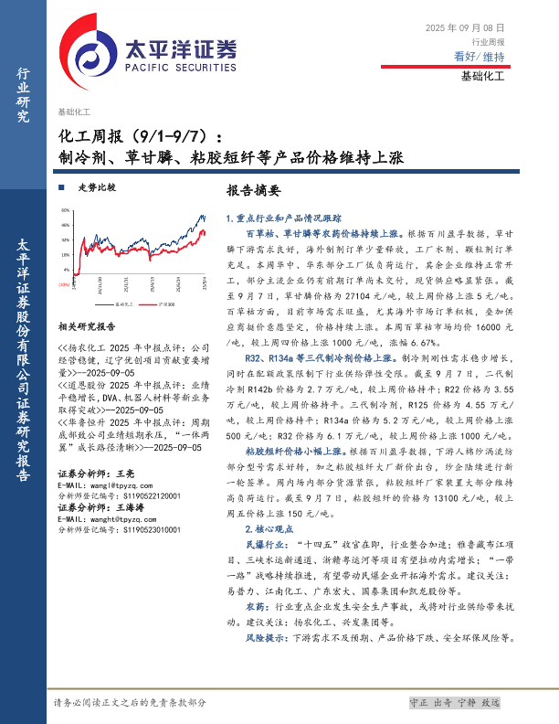 【太平洋证券】【202509】化工行业周报(9/1-9/7):制冷剂、草甘膦、粘胶短纤等产品价格维持上涨-34页