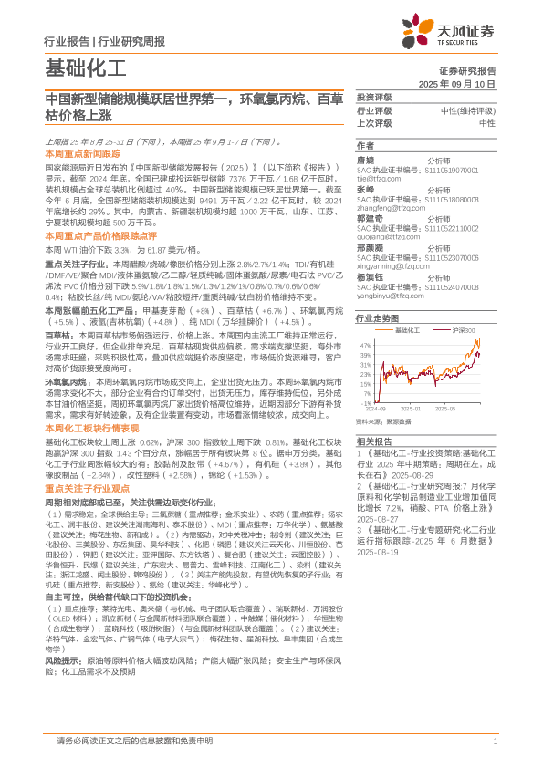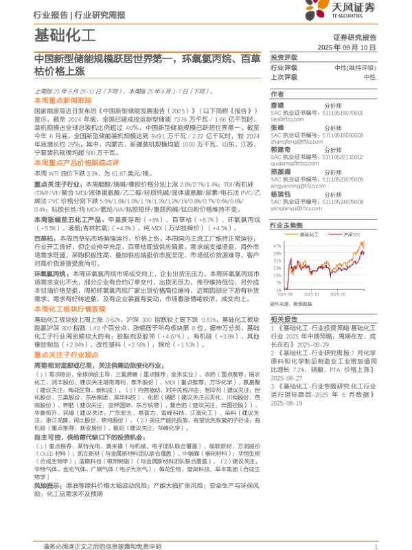 储能发展 行业研究 投资建议 基础化工 价格跟踪