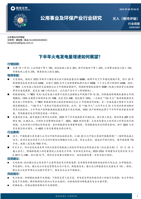【国金证券】【202509】20250906-国金证券-公用事业及环保产业行业周报-16页