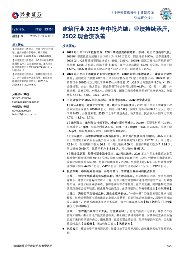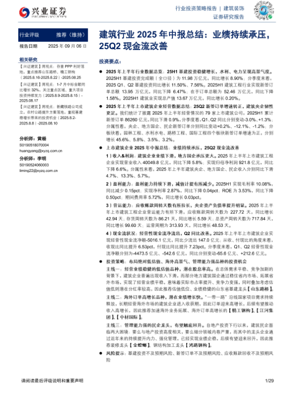 【兴业证券】【202509】建筑行业2025年中报总结:业绩持续承压,25Q2现金流改善-29页