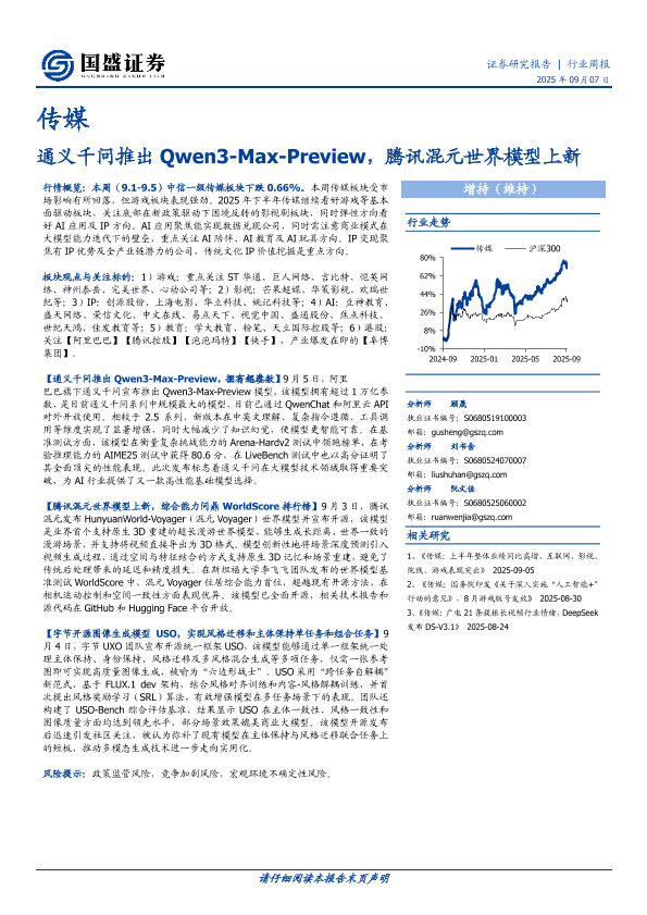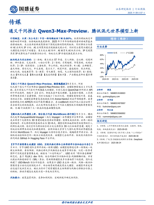 【国盛证券】【202509】传媒行业周报:通义千问推出Qwen3-Max-Preview,腾讯混元世界模型上新-10页