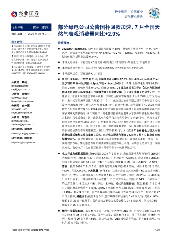 【兴业证券】【202509】公用事业行业周报:部分绿电公司公告国补回款加速,7月全国天然气表观消费量同比+2.9%-26页