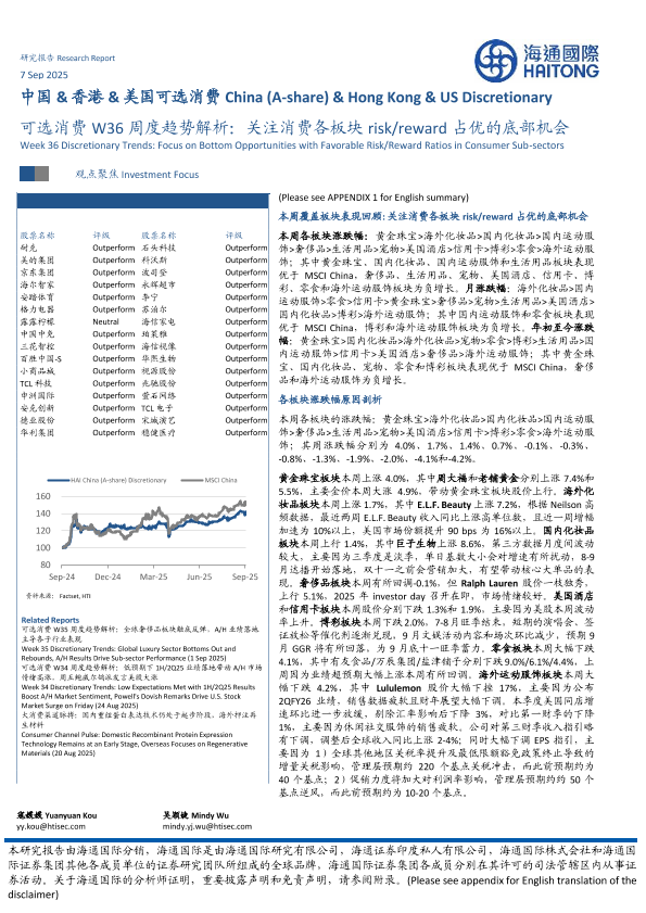 【海通国际】【202509】中国&香港&美国可选消费 China(A-share)& Hong Kong& US Discretionary 可选消费 W36周度趋势解析:关注消费各板块 risk/reward占优的底部机会-15页