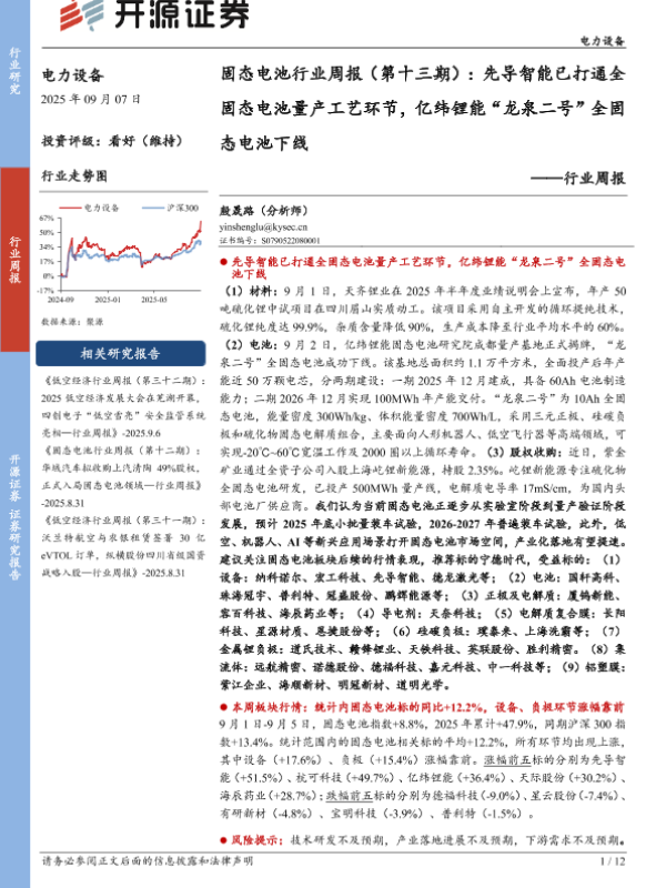 【开源证券】【202509】固态电池行业周报(第十三期):先导智能已打通全固态电池量产工艺环节,亿纬锂能“龙泉二号”全固态电池下线-12页
