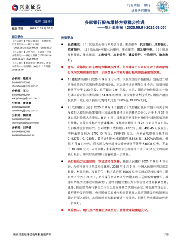 流动性改善 股东增持 行业评级 银行业 投资建议