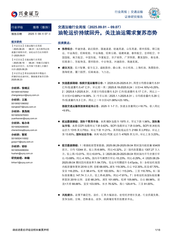 【兴业证券】【202509】20250907-兴业证券-交通运输行业周报:油轮运价持续回升,关注油运需求复苏态势-18页