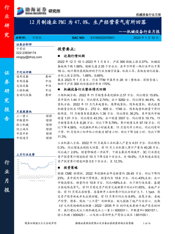 【渤海证券】【20230110】机械设备行业月报:12月制造业PMI为47.0%,生产经营景气有所回落-16页