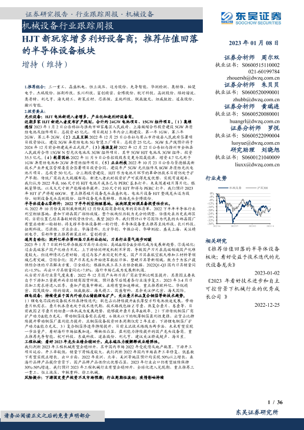 【东吴证券】【20230108】机械设备行业跟踪周报:HJT新玩家增多利好设备商;推荐估值回落的半导体设备板块-36页