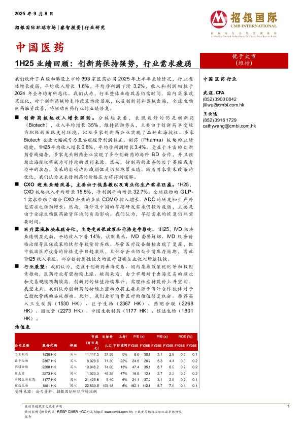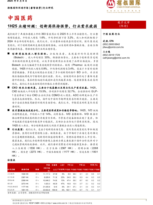 【招银国际环球市场】【202509】中国医药-1H25业绩回顾:创新药保持强势,行业需求疲弱-10页