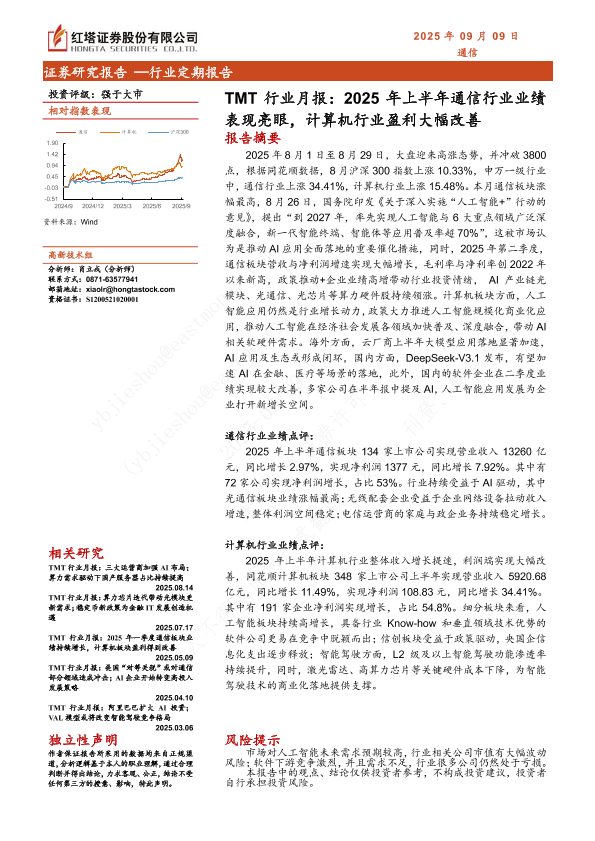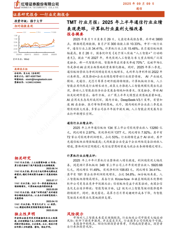 【红塔证券】【202509】TMT行业月报:2025年上半年通信行业业绩表现亮眼,计算机行业盈利大幅改善-12页