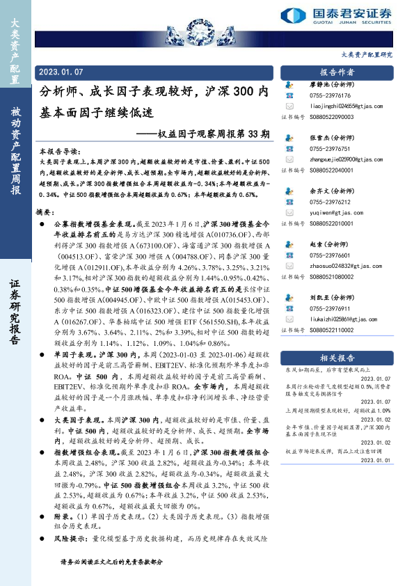 【国泰君安证券】【20230107】权益因子观察周报第33期:分析师、成长因子表现较好,沪深300内基本面因子继续低迷-17页