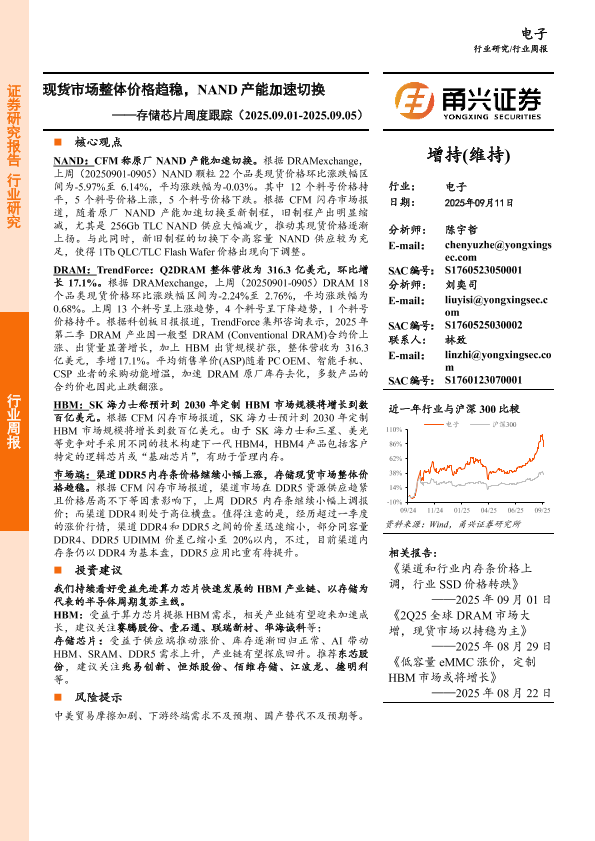 【甬兴证券】【202509】电子行业存储芯片周度跟踪:现货市场整体价格趋稳,NAND产能加速切换-10页