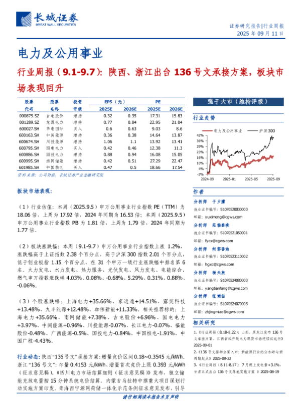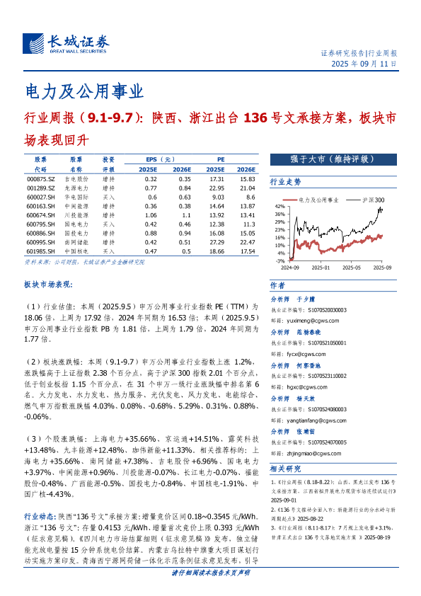 【长城证券】【202509】电力及公用事业行业周报(9.1-9.7):陕西、浙江出台 136号文承接方案,板块市场表现回升-13页