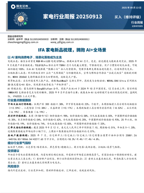 【国金证券】【202509】20250913-国金证券-家电行业周报:IFA家电新品梳理,拥抱AI+全场景.pdf-15页