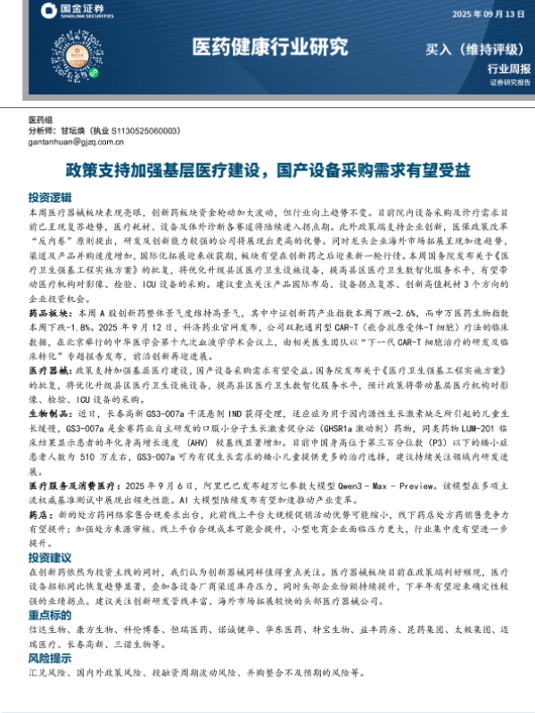 【国金证券】【202509】医药健康行业研究:政策支持加强基层医疗建设,国产设备采购需求有望受益-16页