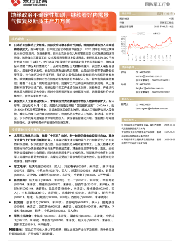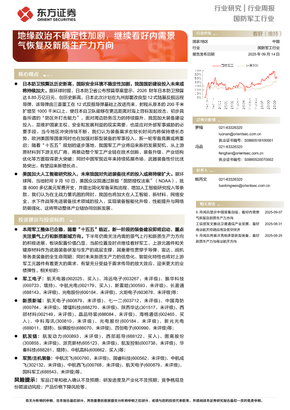 【东方证券】【202509】国防军工行业行业周报 ——地缘政治不确定性加剧,继续看好内需景气恢复及新质生产力方向-13页